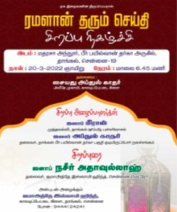 நமது அனைத்து கிளைகள் மற்றும் வட்டங்கள் சார்பாக இலவச ரமலான் கிட்ஸ் தேவையுடையோருக்கு குறிப்பாய் தாஷமகான், புளியந்தோப்பு பகுதிவாழ் பள்ளி இமாம்களுக்கும், மோதினார்களுக்கும் வழங்கப்பட்டன.